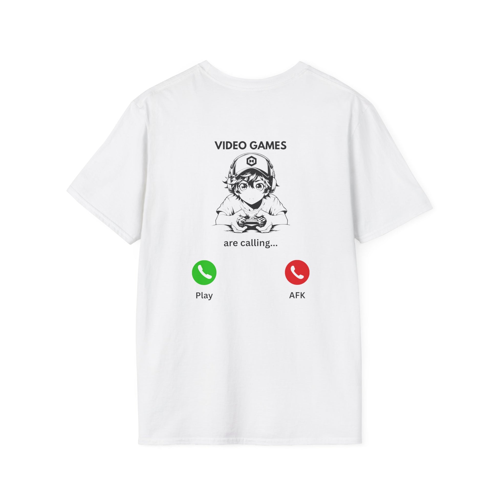 A lightweight cotton tee that speaks to players who live for the next match. This classic crew-neck shirt features a minimalist chest logo and a bold back illustration: an engrossed gamer with the words “VIDEO GAMES are calling...” and call-style Play / AFK icons. It drapes casually, holds its shape, and keeps printed details crisp thanks to a smooth ring-spun knit that’s made for everyday wear. Wear it during late-night sessions, meetups, or while streaming — it reads like a shared inside joke among friends who choose the controller over the rest of the world.